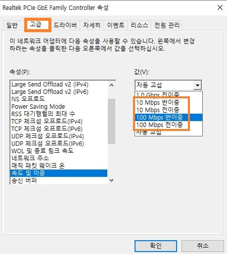 3.상단의 고급 탭을 클릭하신 후 속도 및 이중(Speed & Duplex) 항목을 클릭하신 후
