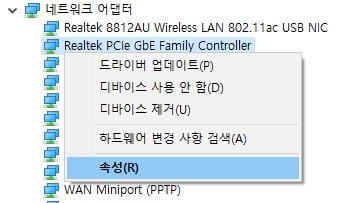 2.네트워크 어댑터를 클릭하신 후 이용하시는 랜카드 우클릭 -> 속성을 클릭해주세요.