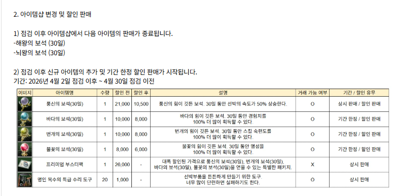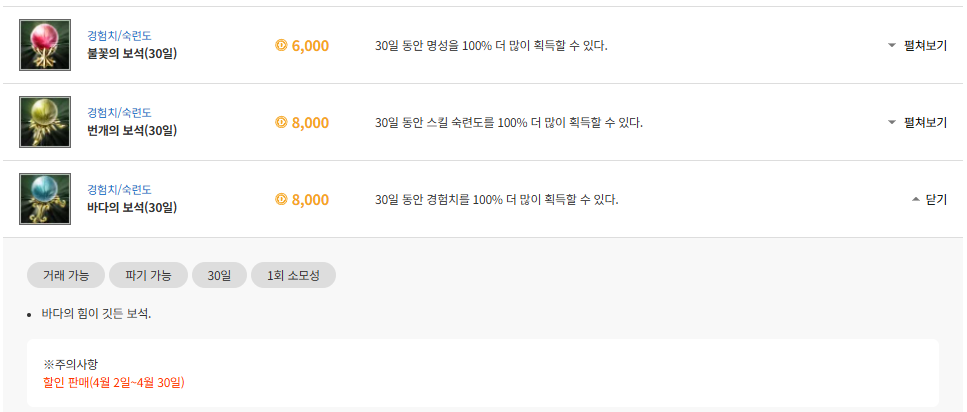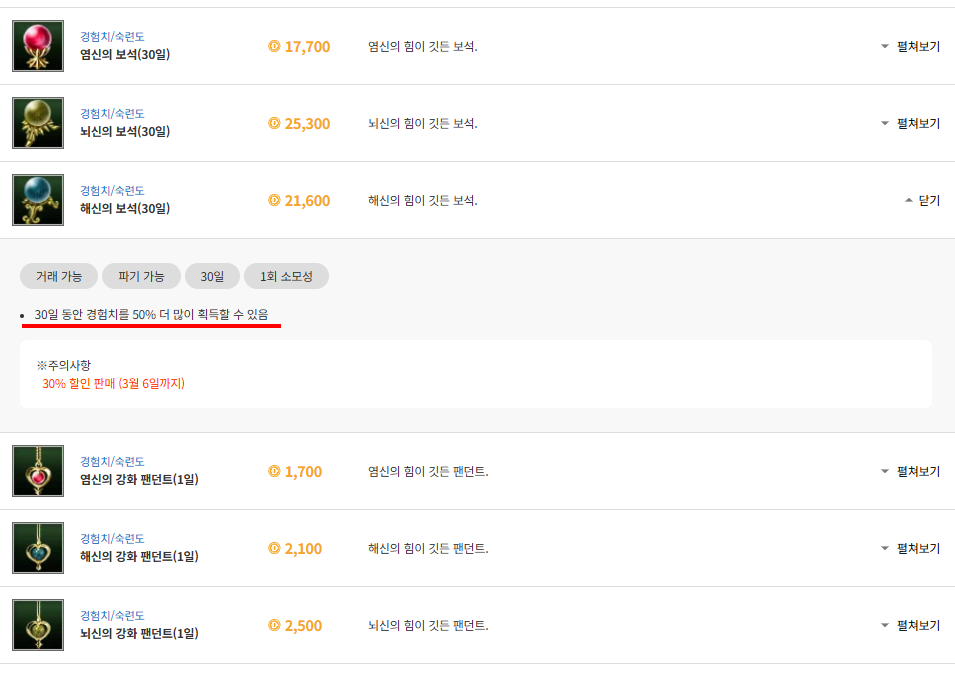 경험치 100%, 숙련도 100%, 명성 100% 아이템을 나름 저렴하게 내놓는 건 좋은 변화이긴 한데..