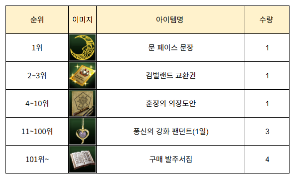 주의 사항 : 합계 레벨 21이하의 캐릭터는 보상을 받을 수 없습니다.