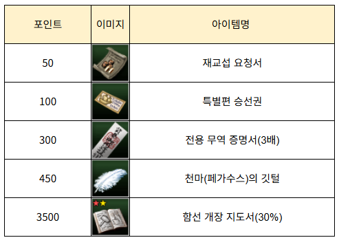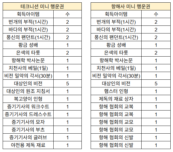 행운권을 사용하여 획득할 수 있는 아이템은 다음과 같습니다.